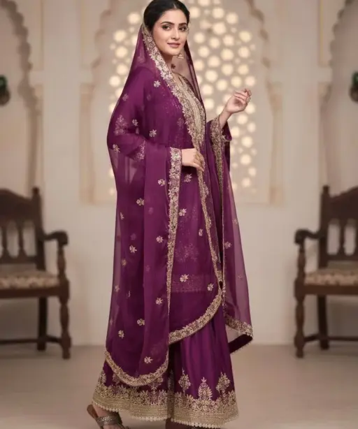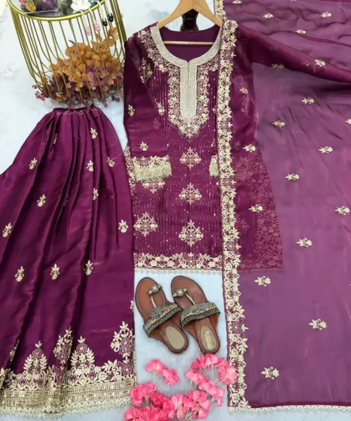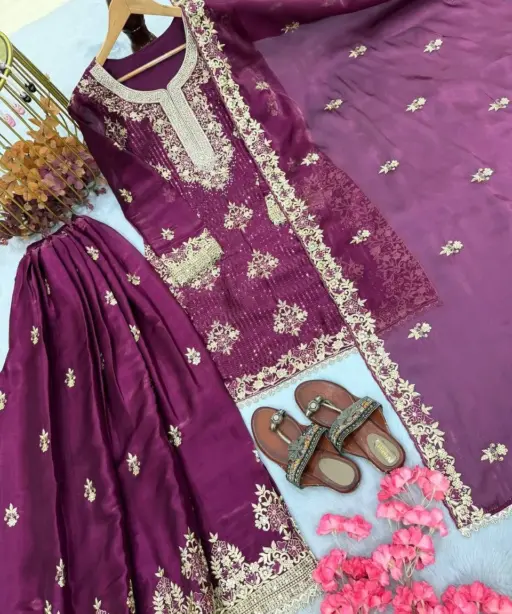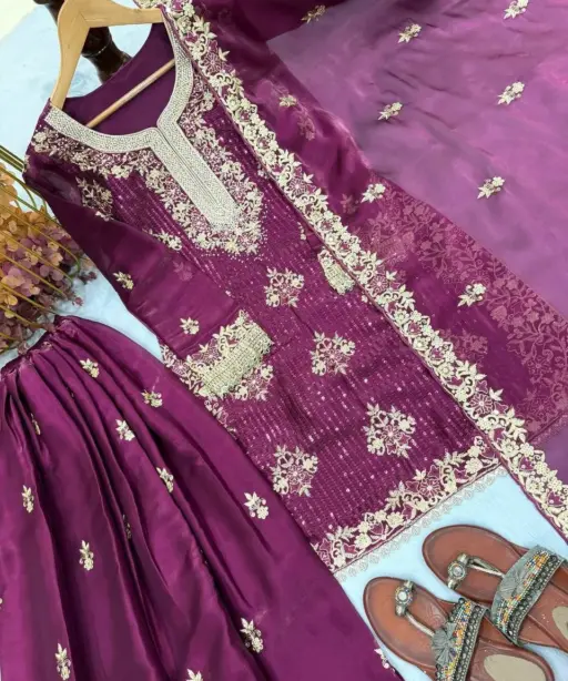 | Top | :Pur Gmy Silk With Heavy Embroidery 5 mm Sequence Work With Jarkhan Diamond Work With Sleeves |