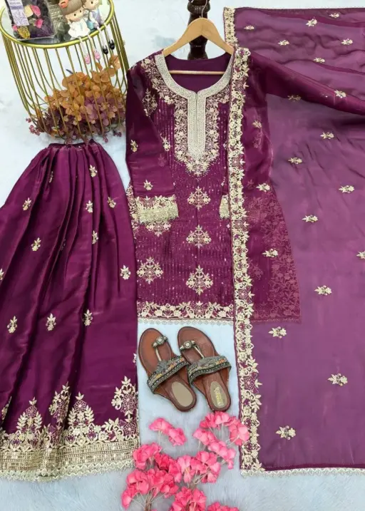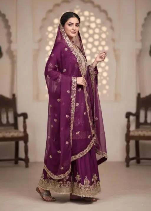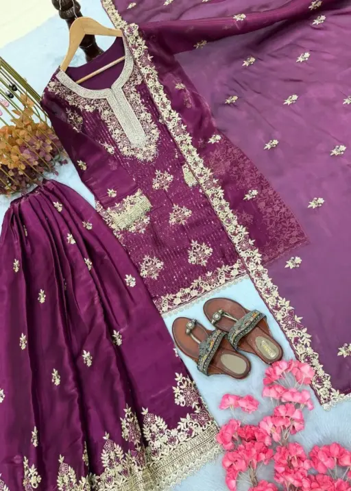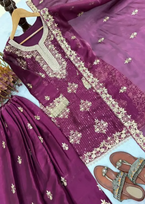 Top:Pur Gmy Silk With Heavy Embroidery 5 mm Sequence Work With Jarkhan Diamond Work With Sleeves