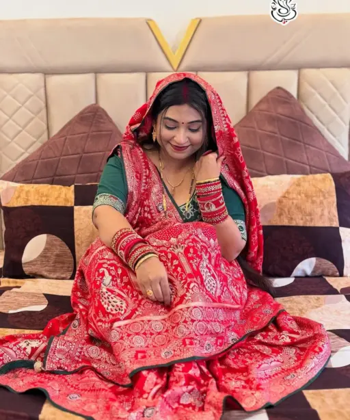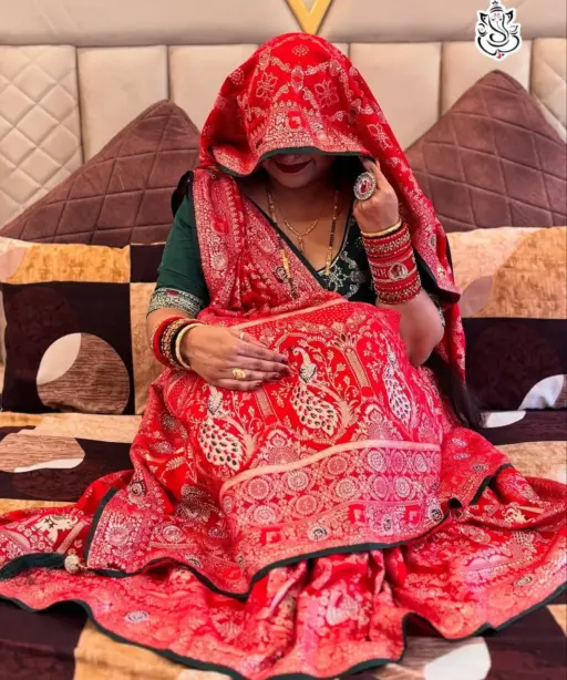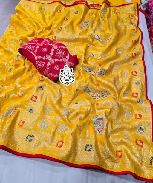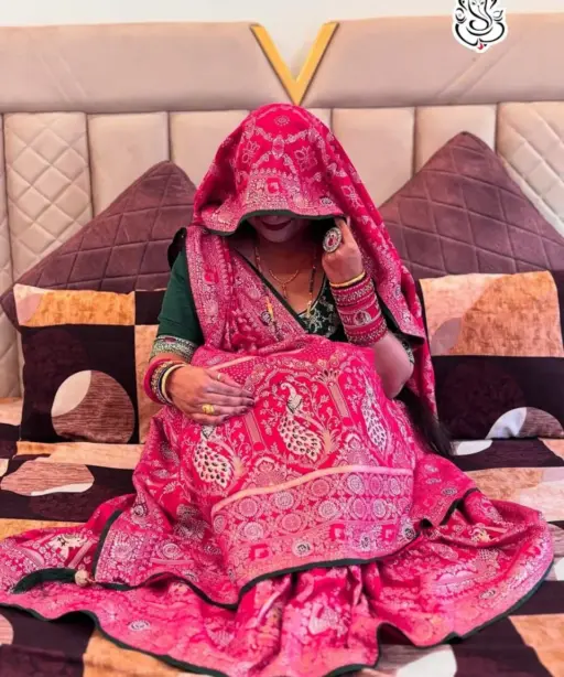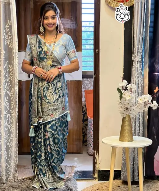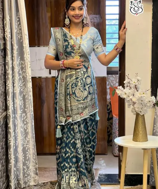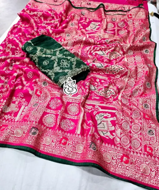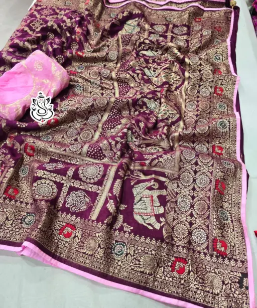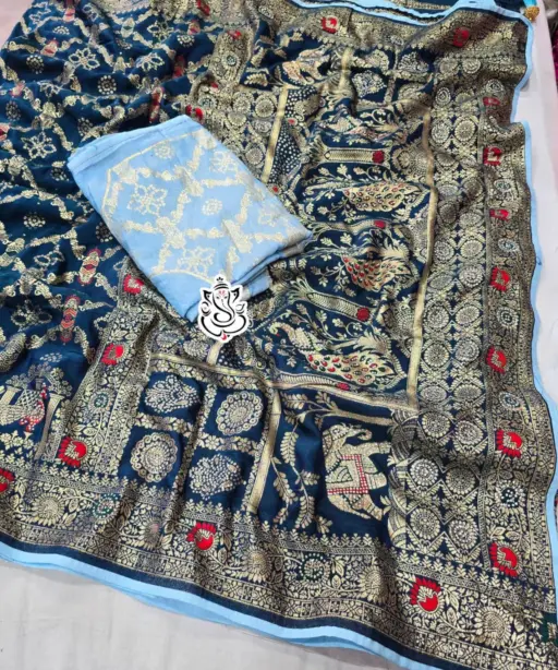 | Saree | Pure Dola Viscose with meenakari jacquard weaving, rajwadi peacock design, jarkan diamond work, latkan, matching piping on full saree |