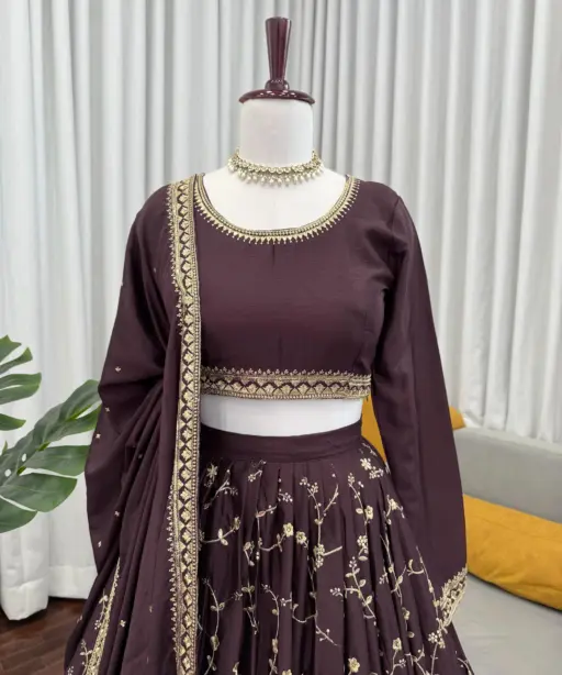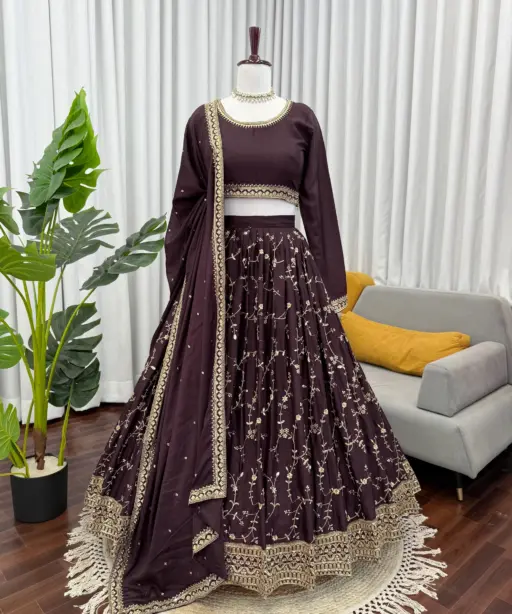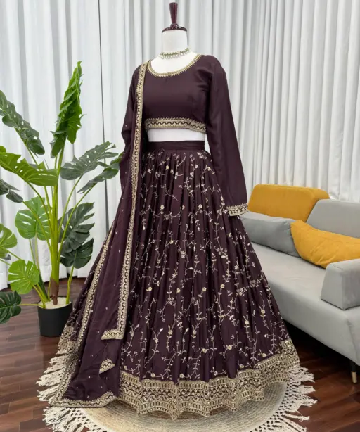| Lehenga | Chinon Silk with Thread and Sequence Work, Fully Stitched (Fits up to Size 44), Inner Soft Micro Lining, with Cancan and Canvas |