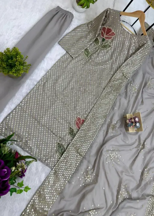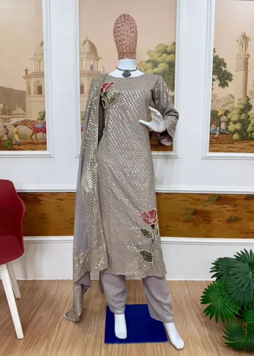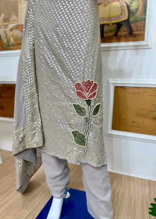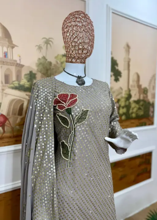 | Top | FAUX GEORGETTE DUAL SEQUINS HEAVY EMBROIDERY & PEARL MOTI WORK Sleeve Length 18 Inch top 48 Length |