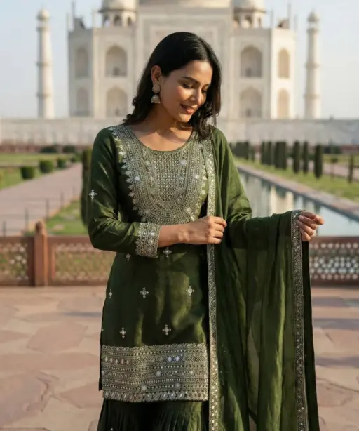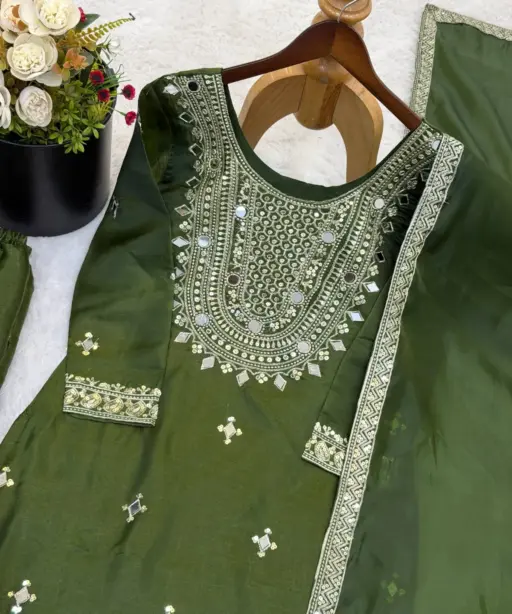 | Top | Pure GMY SILK With Heavy Embroidery Sequence And Real Mirror Work With Full Sleeve 39-40 Inch Length |