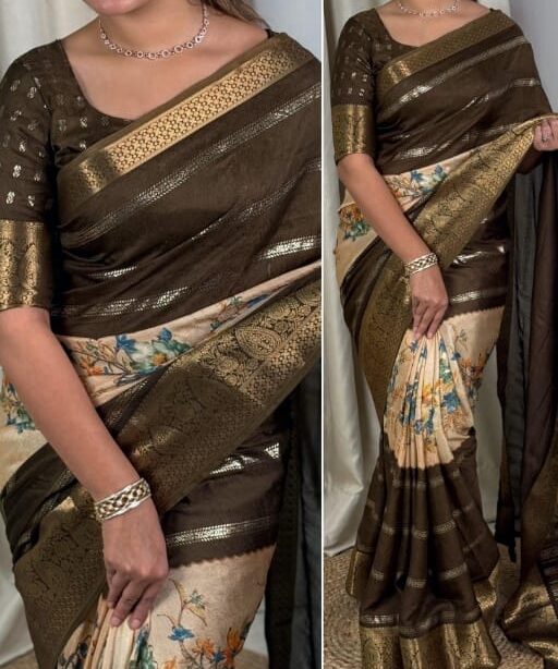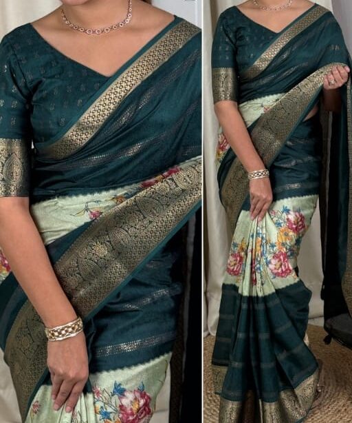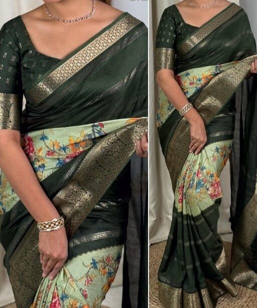 Elegant Dull Moss Printed Saree with Zari Jacquard Border & Foil Print – Timeless Style Meets Modern Grace