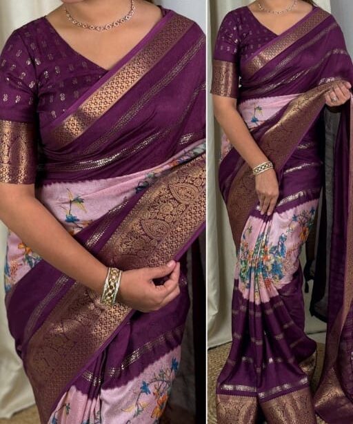 | Work | 1-zari jacquard border in full saree & blouse 2-position mill print in saree with cotton tussels in pallu 3-zari mill foil print in full saree |