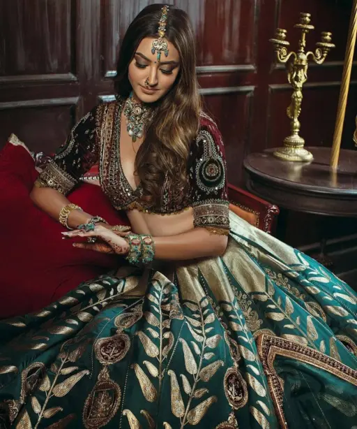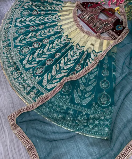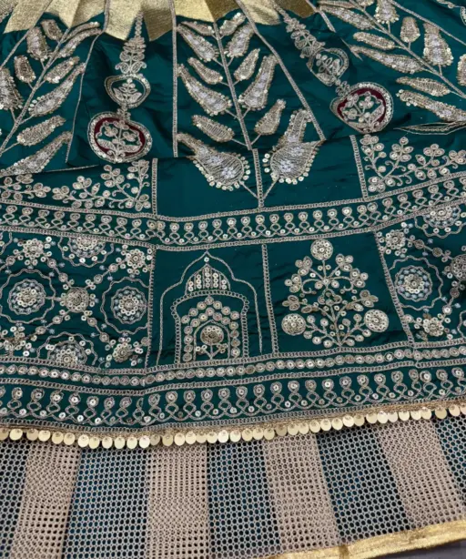 | Lehenga | Premium Mulmul Satin Silk embellished with beautiful thread, zari, dori, and heavy sequins work. Comes with heavy cancan, canvas, and double inner covering. Flair: 3.5 MTR (Semi-stitched). |