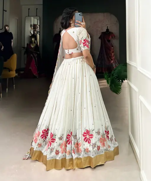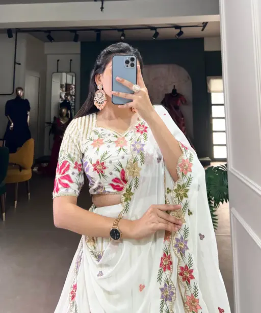 Embellished White Lehenga Choli With Flower Embroidery Work Designer Saree