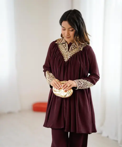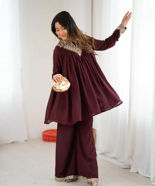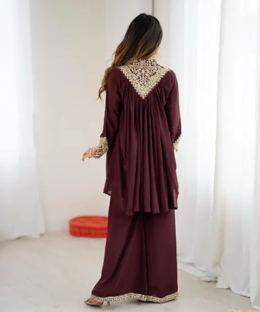 | Bottom | Heavy Chinon Palazzo with Embroidery Sequence Work, Length 39-40″ (Fully Stitched) |