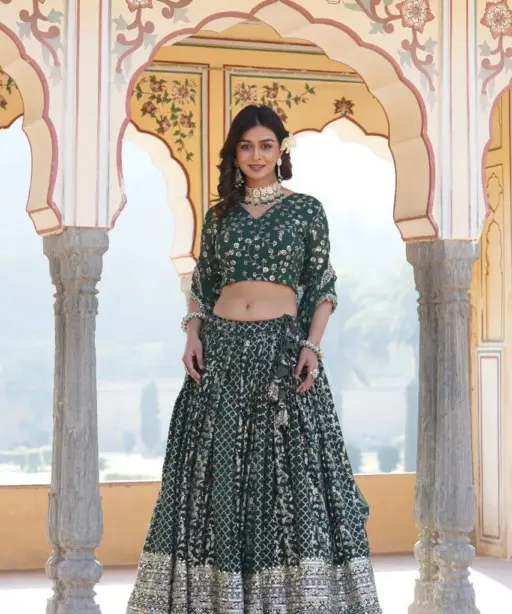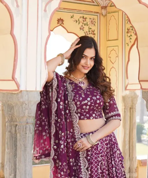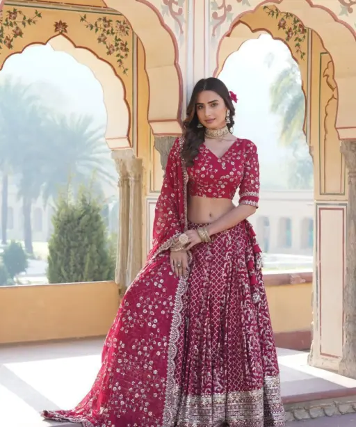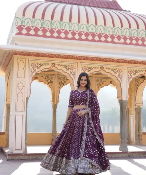 | Lehenga | Pure viscose jacquard with embroidered sequins work, full-stitched |