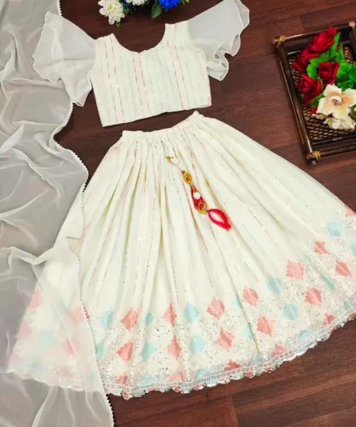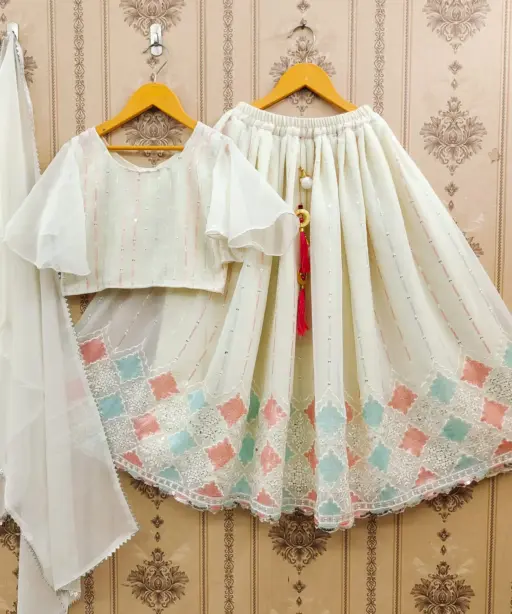 | Lehenga | 3-Colour Sequins Embroidered Work with Cut-Work Border Design on Blooming Georgette Fabric, Inner: Micro Cotton |