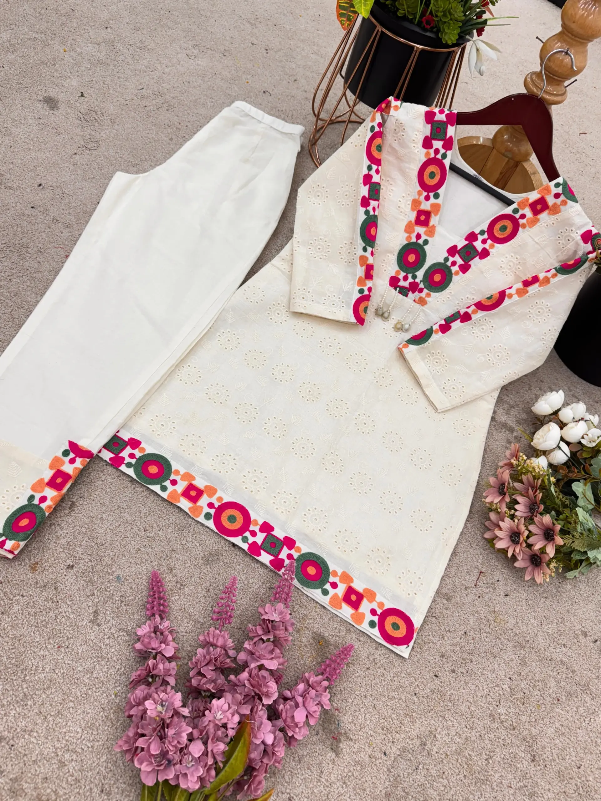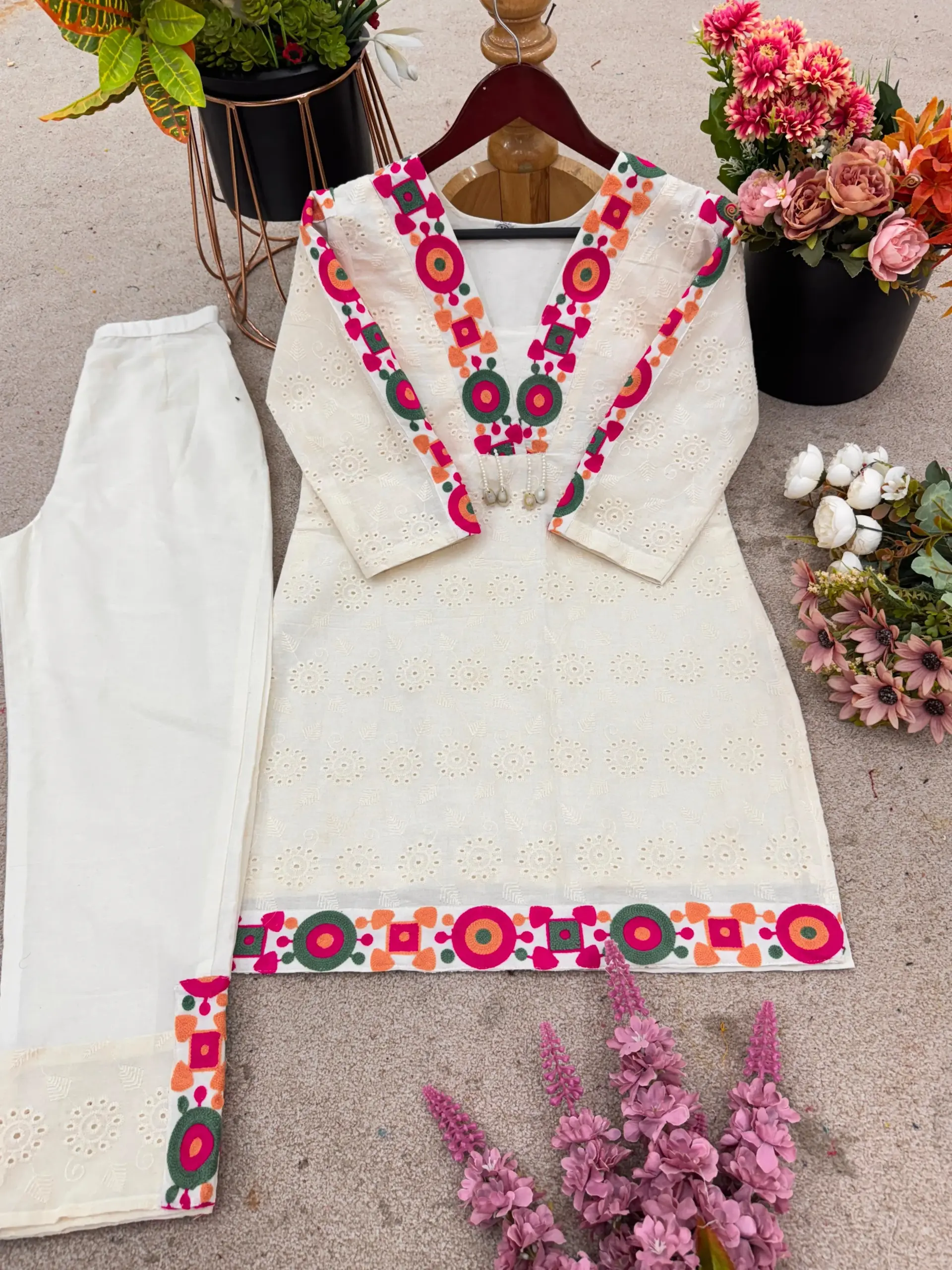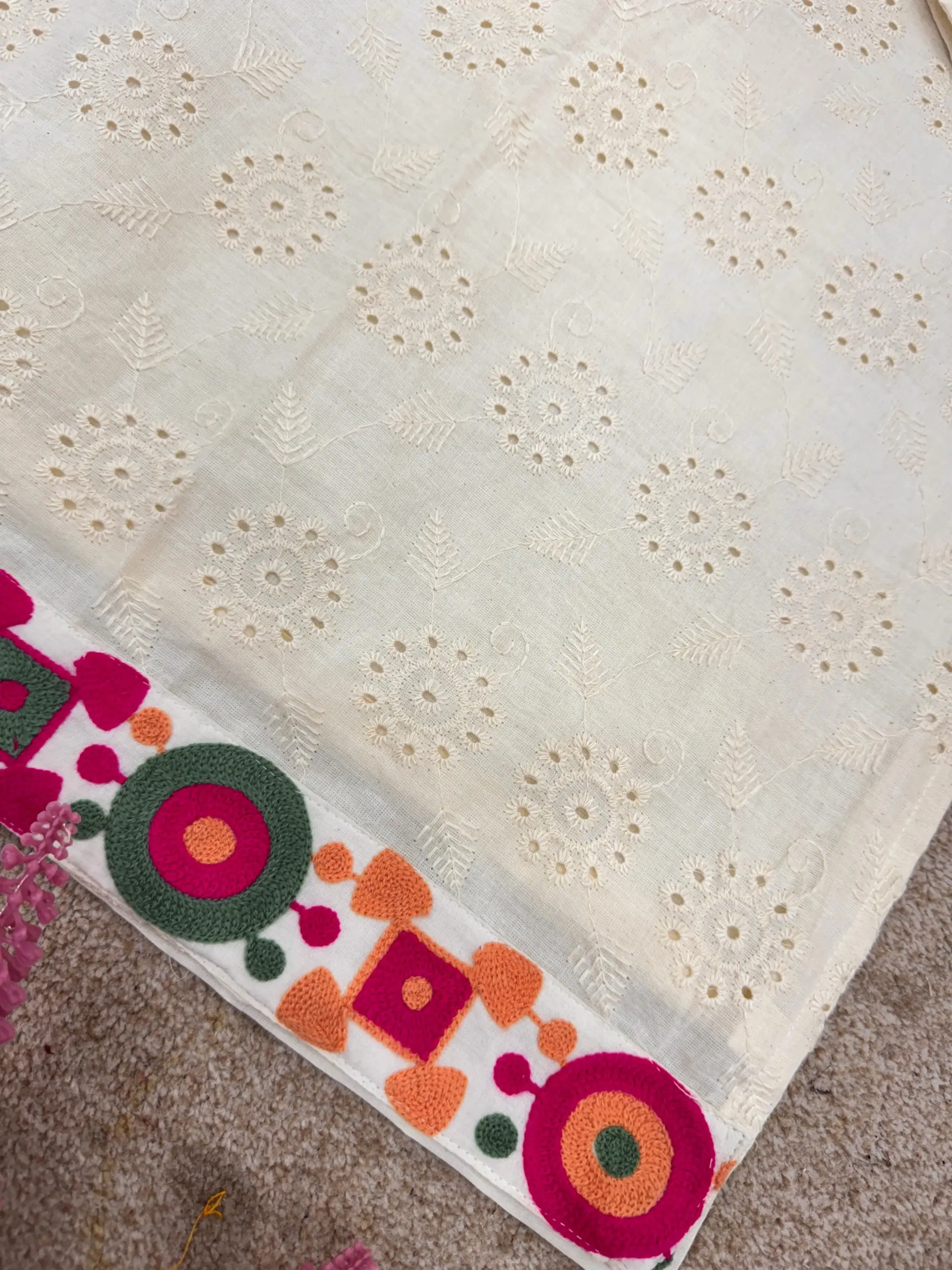 | Bottom | Pure Khadi Cotton with Schiffli Thread Work, Pant Length 37-38 inches |