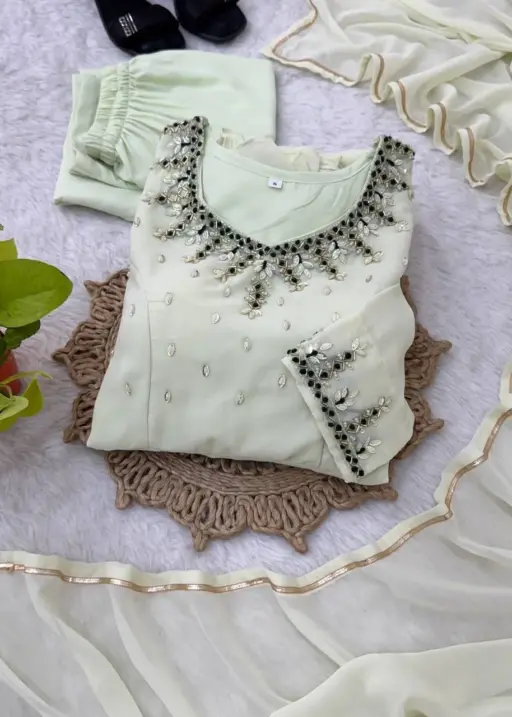 | Top | Fox Georgette Heavy Quality with Handwork Neck & Sleeves, Inner: American Heavy Butter Cotton, Length: 52-54 in, Flair: 8 Meter |