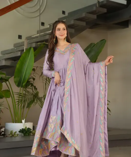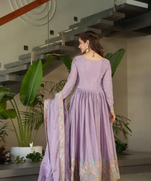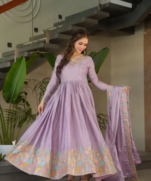 TopChinnon gown with rich sequins & multi-thread embroidery, fancy V-neck, regular full sleeves, length 56″, flair 3.5 mtr, lining cotton (full inner top to bottom), standard stitching with canvas patta
