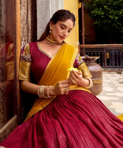 Poly Chanderi (Zari Stripe) with Kalamkari Printed and Zari Weaving Work Waist Supported up to 42 Stitching Stitched with Canvas Closure Drawstring with Zip Length 41 inches Flair 4 meters Inner Micro Cotton | |