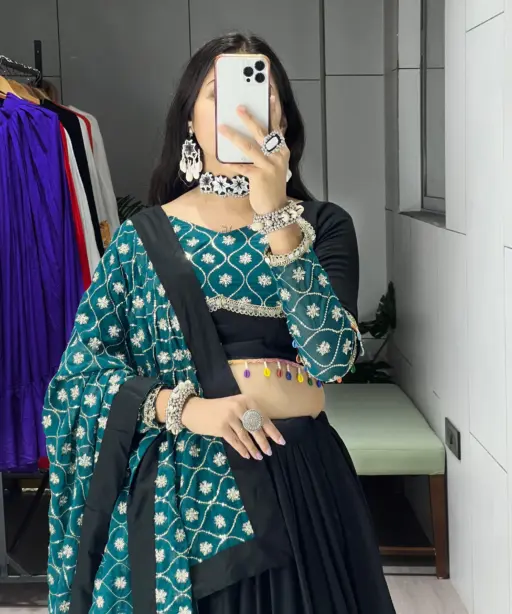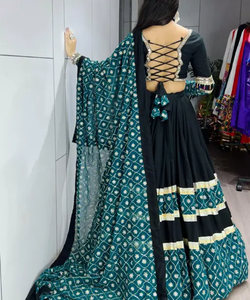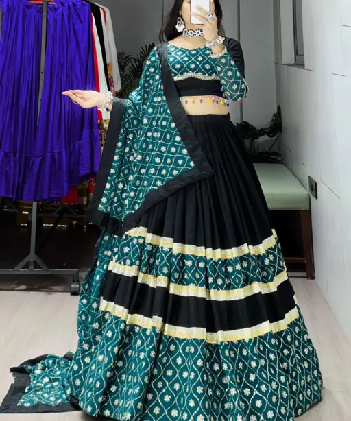 | Lehenga | Pure Rayon Cotton, Plain with Sequence Embroidery & Gota Work, Stitched with Canvas, Drawstring & Zip Closure, Waist Supported up to 44”, Length 41”, Flair 6 Meter, Inner Micro Cotton |