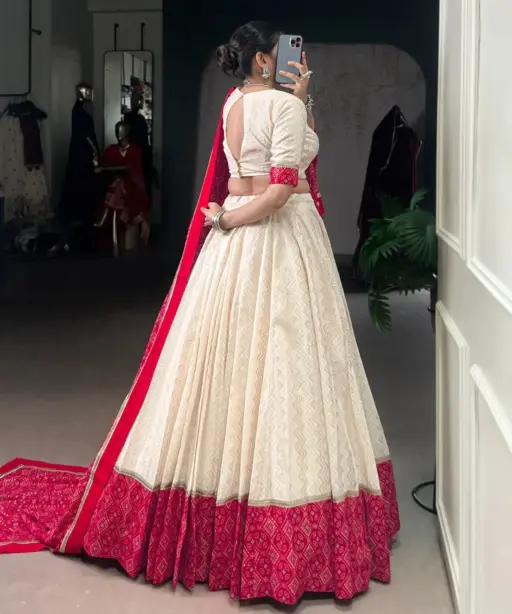 | Lehenga | Cotton with Zigzag & Bandhej Print, Sequins Lace Touch Up, Stitched with Canvas & Full Inner, Length 41, Flair 5 Meter, Inner: Micro Cotton, Waist Support Up To 42, Closure: Drawstring with Zip |
