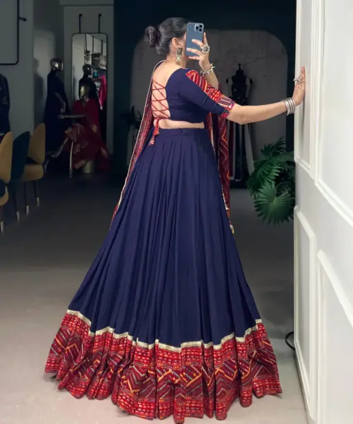 | Lehenga | Pure Rayon, Bandhej Print & Foil Work with Lace Touch Up, Waist Support up to 42, Drawstring with Zip Closure, Length 41, Flair 8 Meter, Stitched with Canvas & Full Inner, Inner: Micro Crepe |