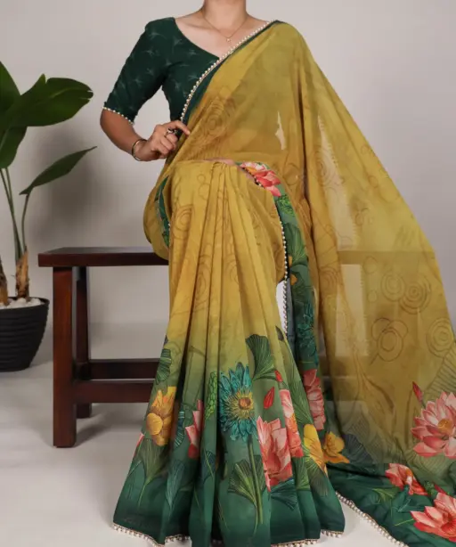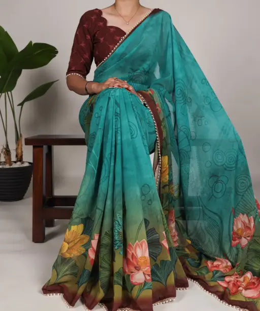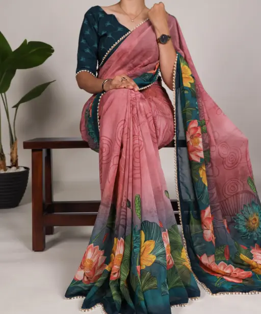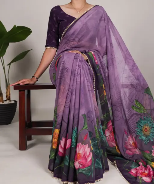 | Saree | Georgette with Floral Print and Pearl Lace Border, Length 5.5 Meter |