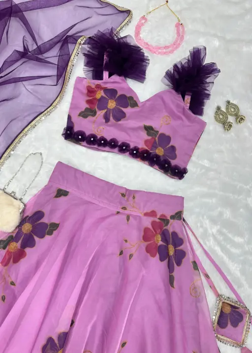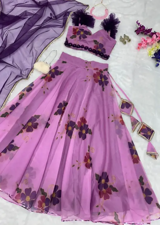 LehengaPure Organza Silk (Floral Print), Flair: 8 Meter