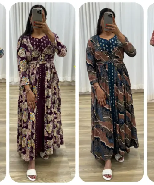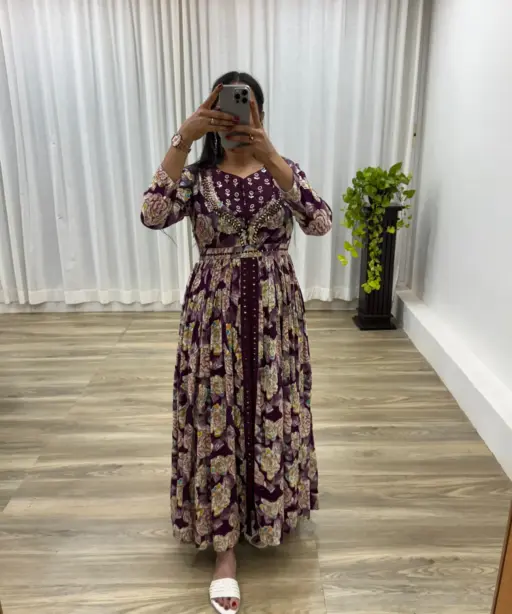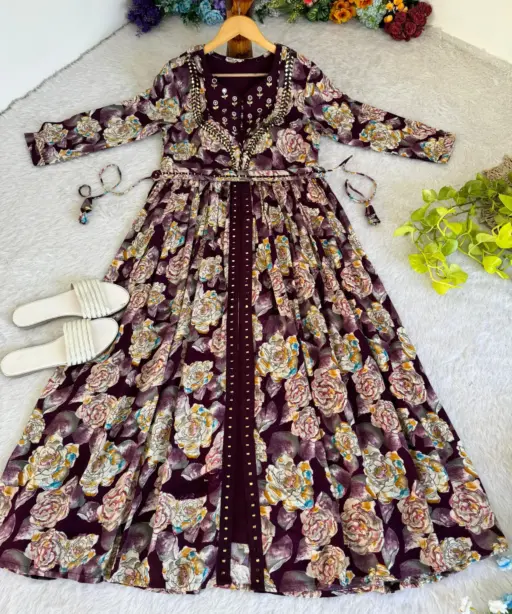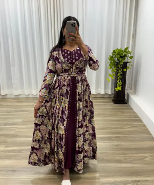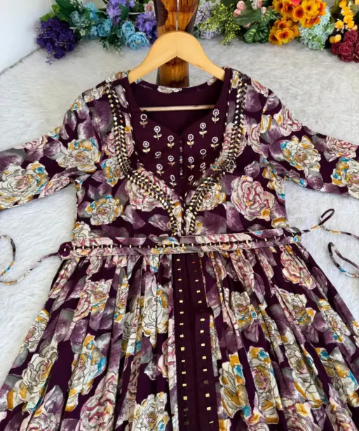Floral Printed Slit Cut Gown With Handwork And Real Mirror Work