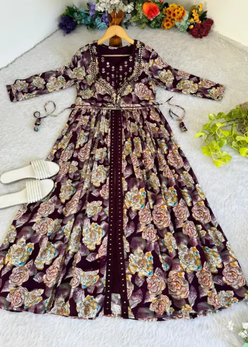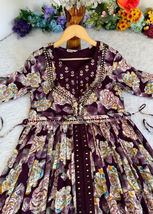 Keywords: floral printed gown, slit cut gown, middle slit gown, mirror work gown, embroidery work gown, ethnic gown, handwork gown, traditional gown, wedding gown, festive gown, ethnic suits, ethnic fashion, mirror work embroidery, floral design gown, cultural wear, special occasion gown, ethnic wear, traditional mirror work dress, hand-embroidered gown, ethnic party wear, designer ethnic gown.