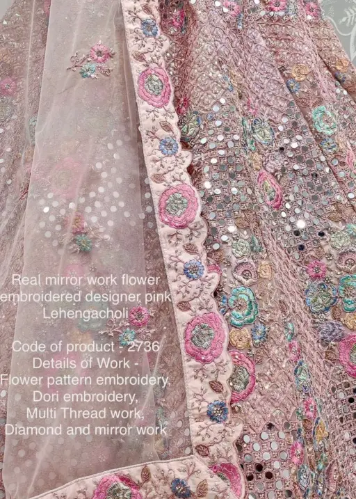 LehengaFlower pattern embroidery, Dori embroidery, Multi Thread work, Diamond and mirror work