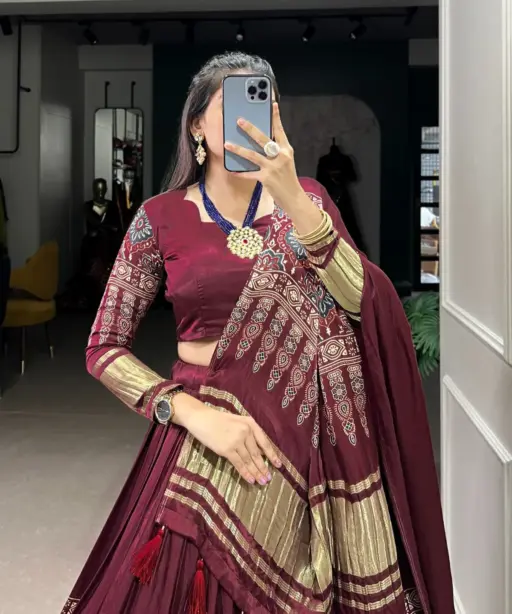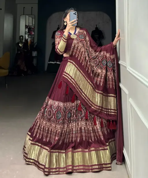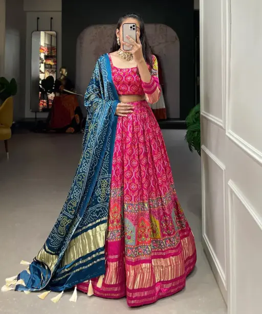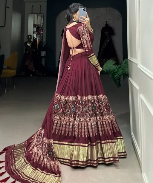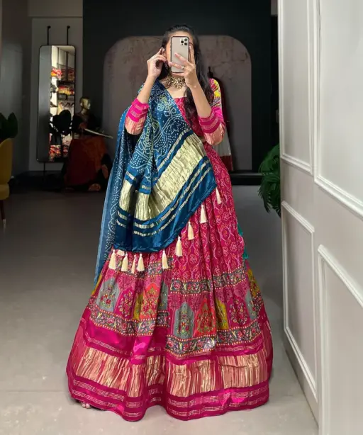 | Lehenga | Gaji Silk with Digital Print and Lagadi Patta, Stitched with Canvas and Can Can, Drawstring with Heavy Tassels and Zip |