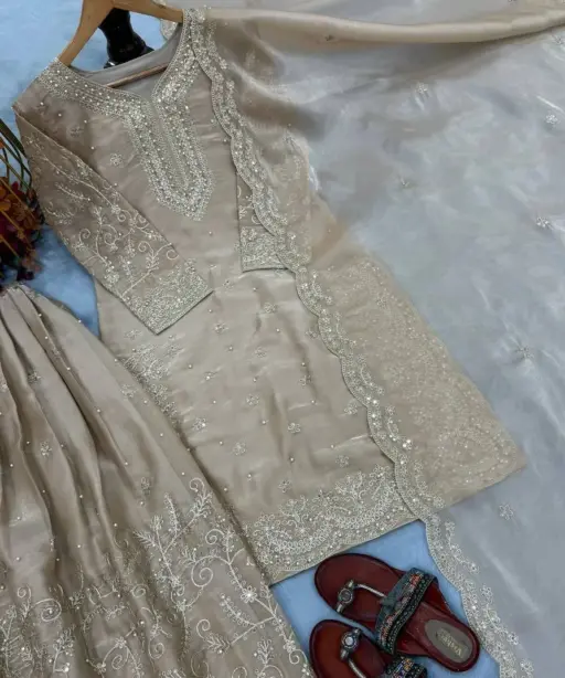 | Bottom | Pur Gmy Silk with Heavy Embroidery 3 mm Sequence & Coding Dori Work with Moti Hand Work 40-41 Inc Length |