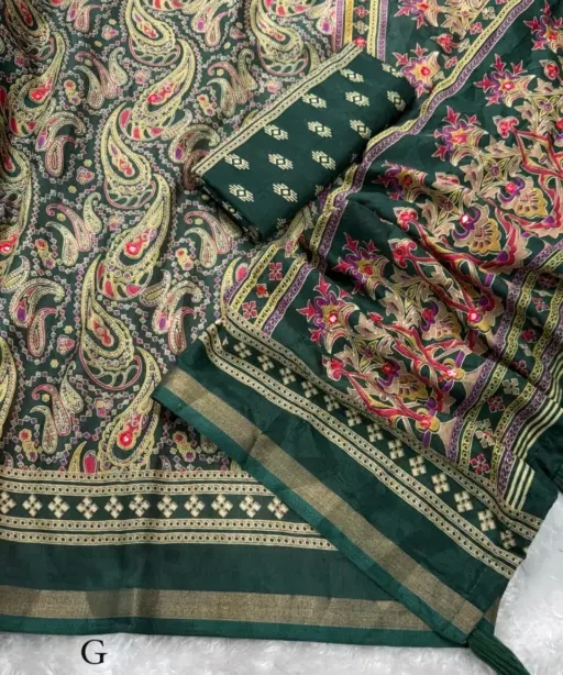 | Pattern | 1- morror work in full saree, 2 – Ajrakh Printed saree with zari jacquard border, 3- Tussles in pallu |