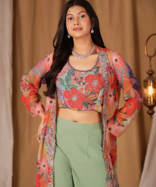 Green Color Designer Indo Western Skirt With Blouse And Jacket