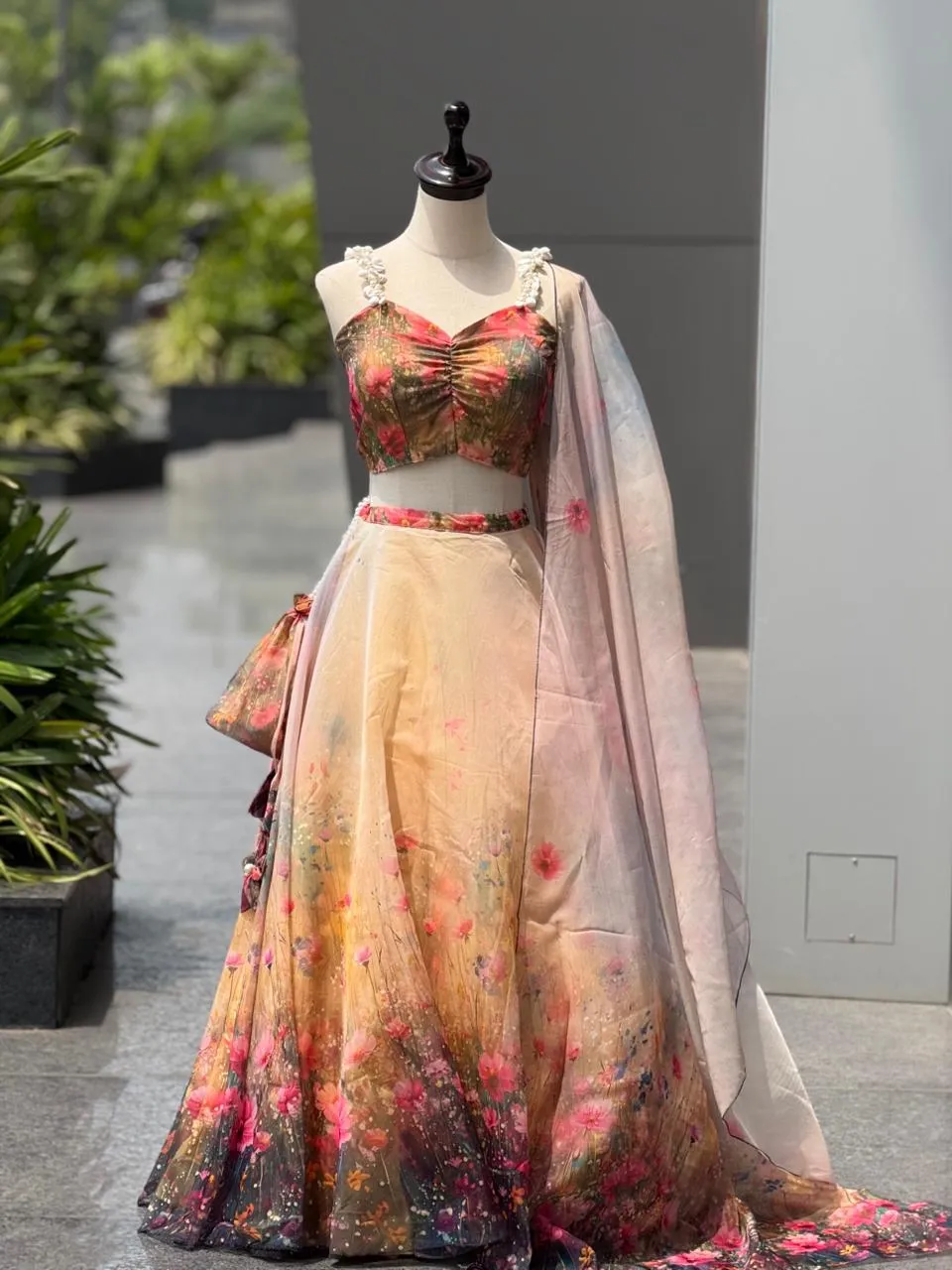 | Lehenga | Pure Organza Digital Printed Lehenga, 8mtr Flair, Canvas Patta, Adjustable Waist Dori |