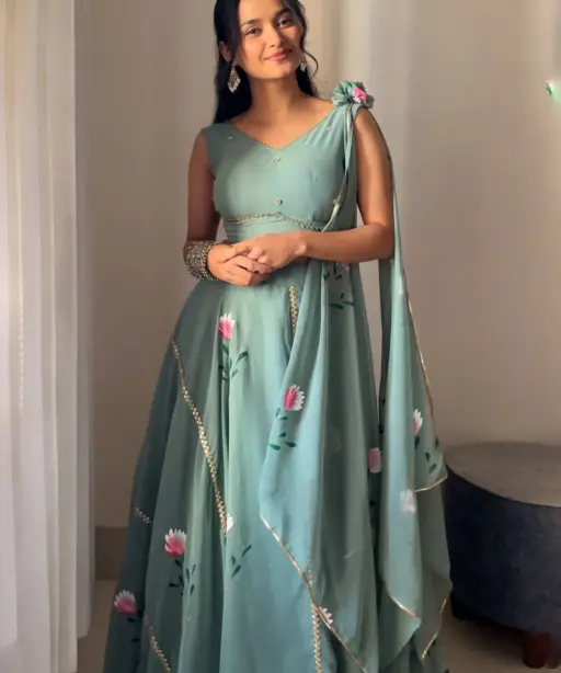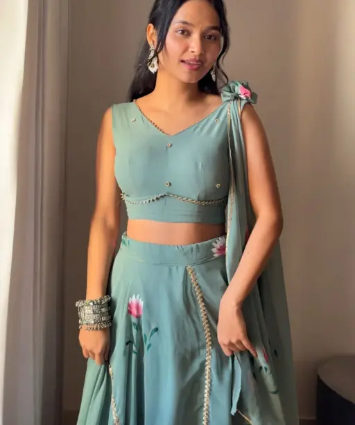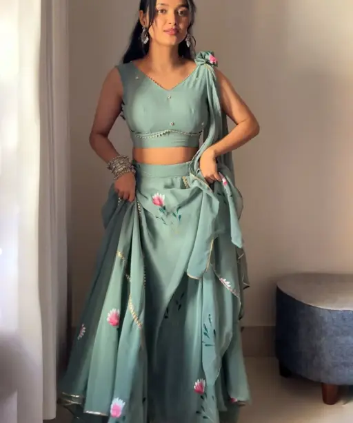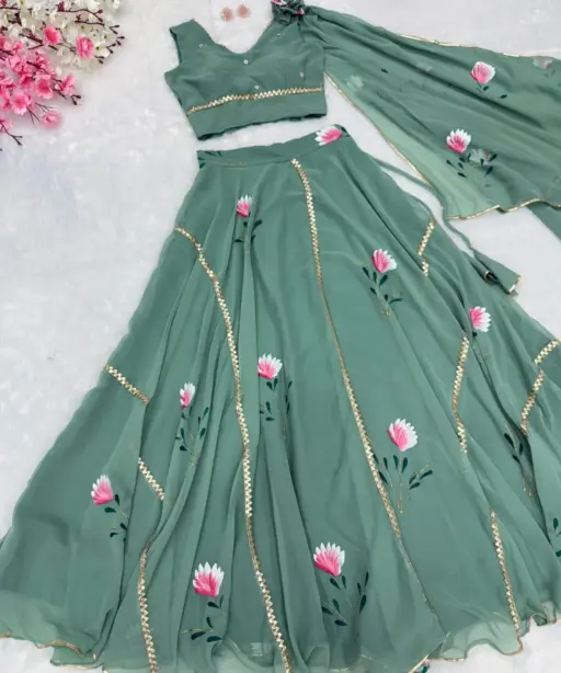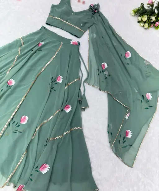 | Lehenga | Georgette hand painted 8mtr flair lehnga with canvas Patta and adjustable waist Dori |