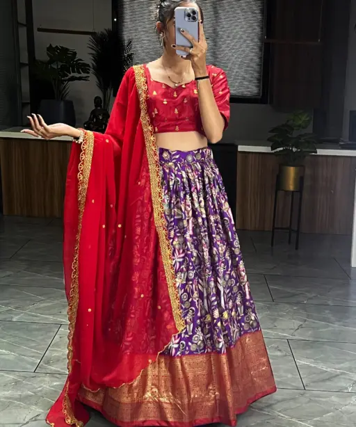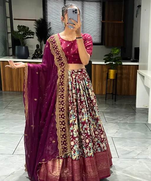 Soft Dola Silk, Fully Printed with Contrast Foil Work Border, Waist Supported up to 42, Drawstring with Heavy Handmade Tassels and Zip, Stitched with Canvas and Can Can, Length41 Inch, Flair 3.8 Meter, Inner Micro Cotton