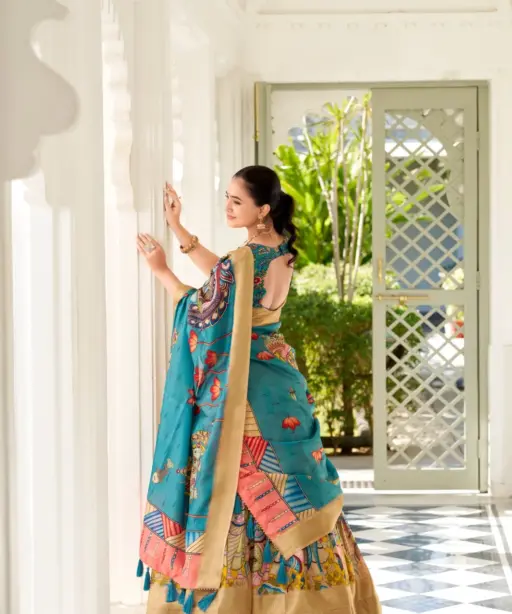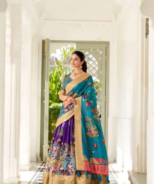 | Lehenga | Dola Silk with Kalamkari print and weaving border, supported up to 42″ waist, stitched with canvas, drawstring with zip, 3.4-meter flair, inner micro cotton |