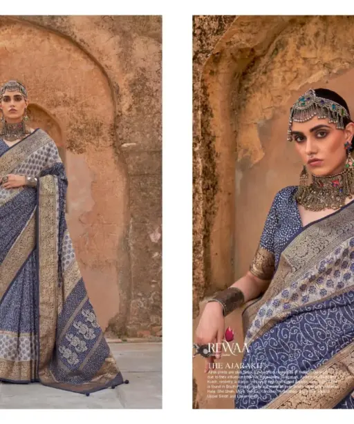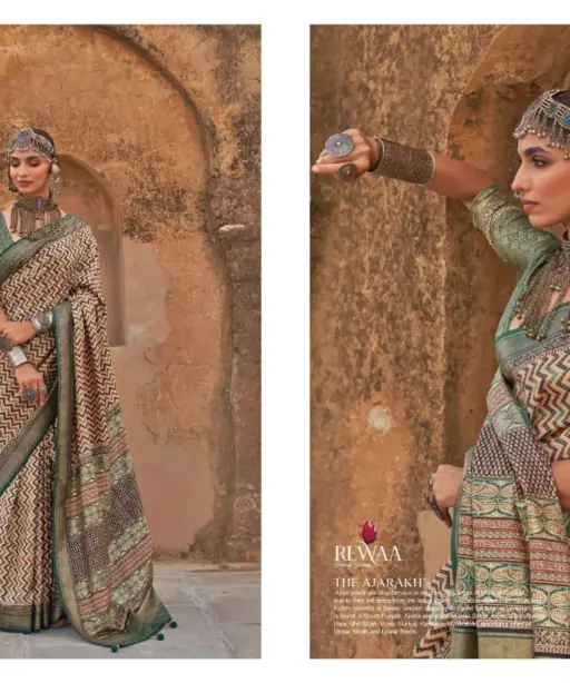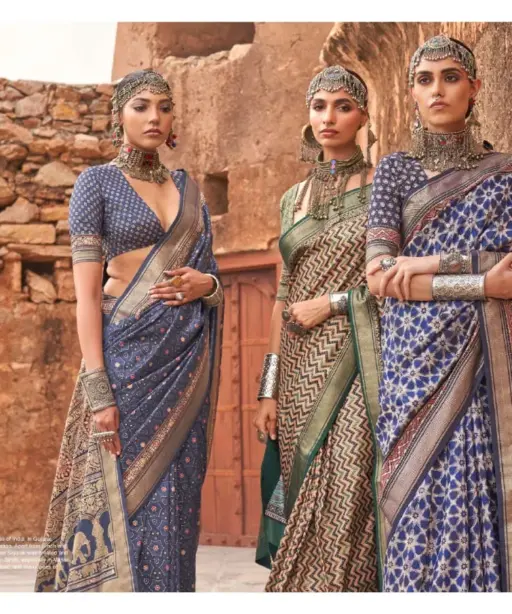 | Saree | Poly Viscose Silk with Superb Ajrakh, Kalamakri Print & Corian Gold Foil Finish Edition with Aqua Finish |