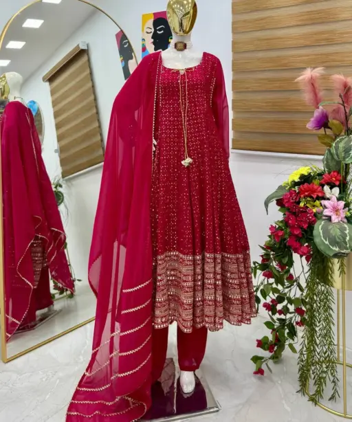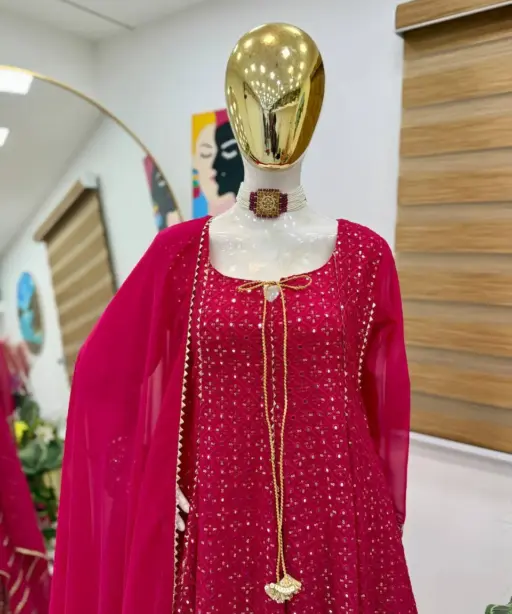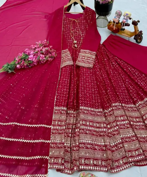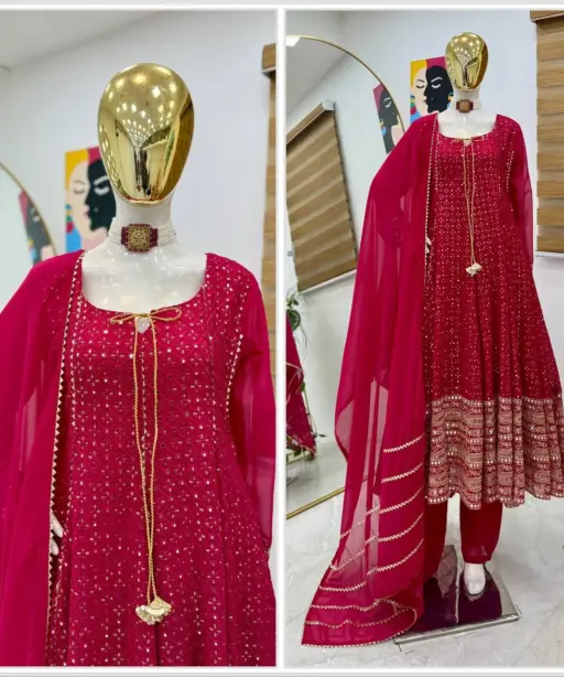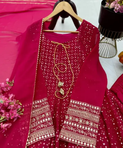 | Top | Fox Georgette With Embroidery Sequence Work | Length: 52 Inch | Neck: V-Round | Sleeves: 20 Inch | Flair: 4 Mtr | Size: M, L, XL, XXL (Fully Stitched) |