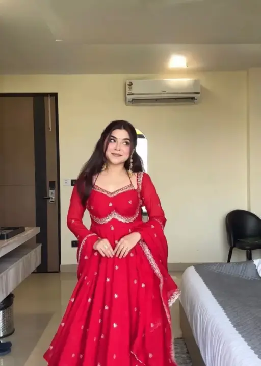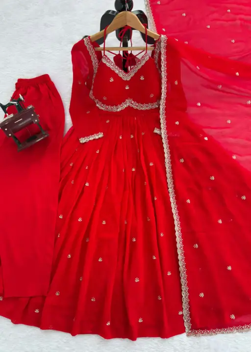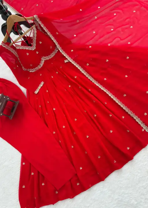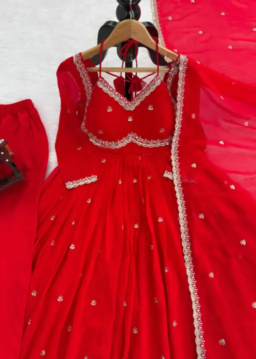| Top | Faux Georgette Anarkali with Thread & Sequence Work, Lining Soft Micro Cotton, Length 52 Inch, Flair 4 Meter, Sizes M(38), L(40), XL(42), XXL(44) with 3XL Margin |