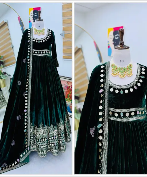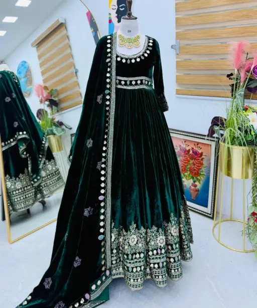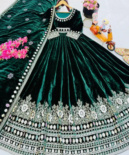 Gown: Heavy Velvet with Embroidery Sequence Work (Flair: 3 Mtr, Length: 58, Neck: Round, Sleeves: 20 Inch)