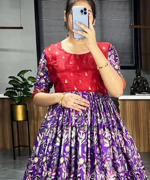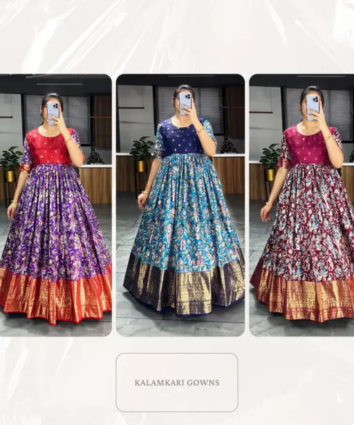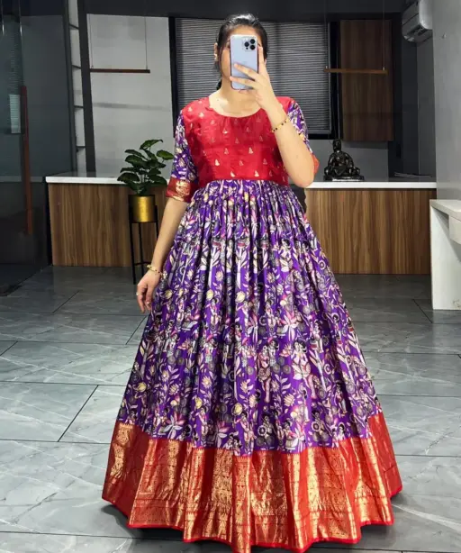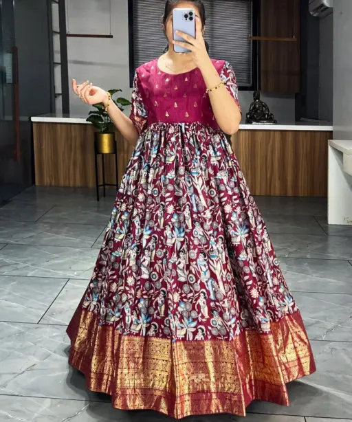 | Top | Soft Dola Silk with Kalamkari Print and Foil Work on Border |