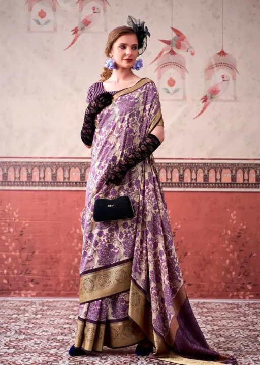 Lavender Tasar Silk Floral Printed Saree