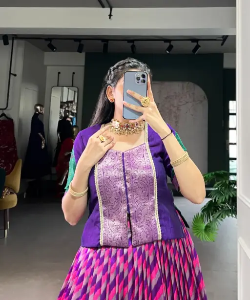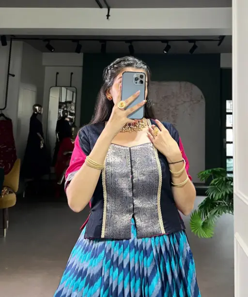 Vichitra Silk with Zari Weaving Work and Lace Touch Up Stitched at 38, Blouse length 19, Sleeve length 12