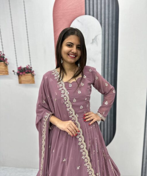 The gown is designed with a flattering fit that enhances your silhouette, allowing you to move with ease while exuding confidence. Paired with a beautifully draped matching dupatta, this outfit gives a refined, traditional touch to your ensemble, elevating the overall look. Whether you’re attending a formal gathering or a celebratory event, this gown ensures you stand out with grace.