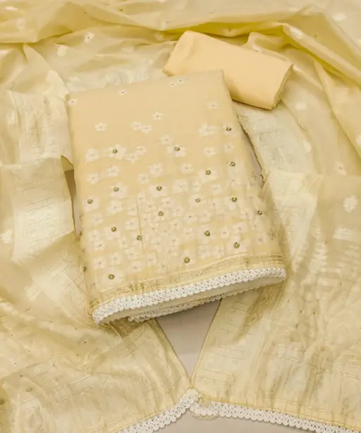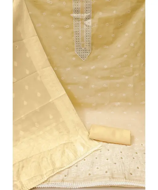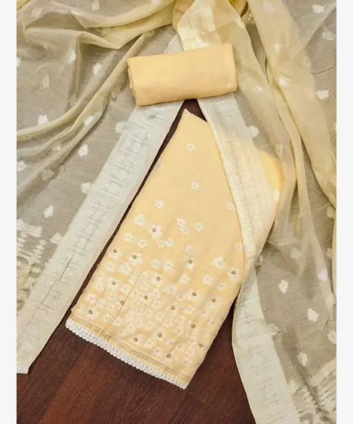| Product Name | Light Yellow Floral Woven With Hand Embroidered Muslin Dress Material |