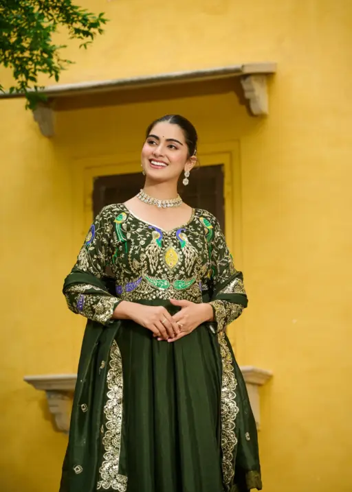 Mehendi Color Festive Gown with Dupatta