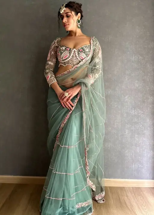 | Saree | Premium Net Embellished with Beautiful Embroidery, Dori, and Sequins Work, Heavy Hand Diamond Work Lace Border (2500 Diamonds in Saree Border) |