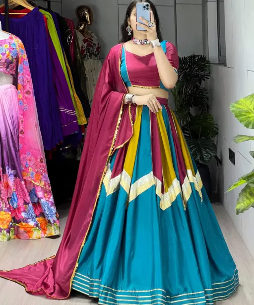 | Lehenga | Chinon, All Over Traditional Colorful Kali with Embellishments, Stitched with Canvas, Length 41″, Flair 6 Mtr, Inner Micro Cotton, Waist Supported Up To 44″, Closure with Drawstring & Zip |