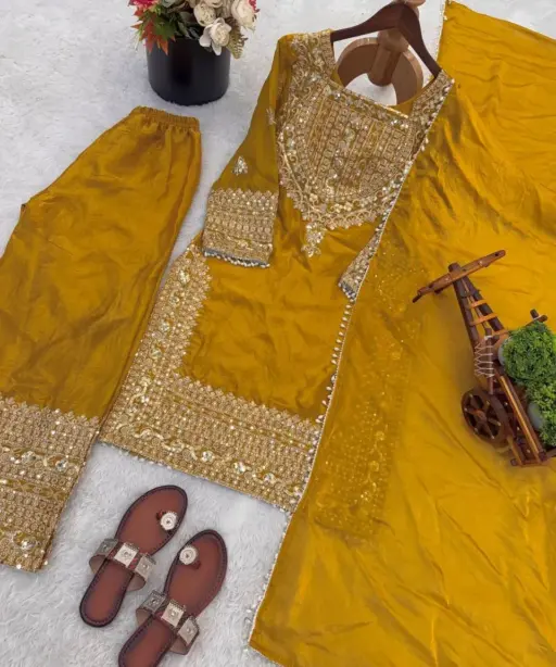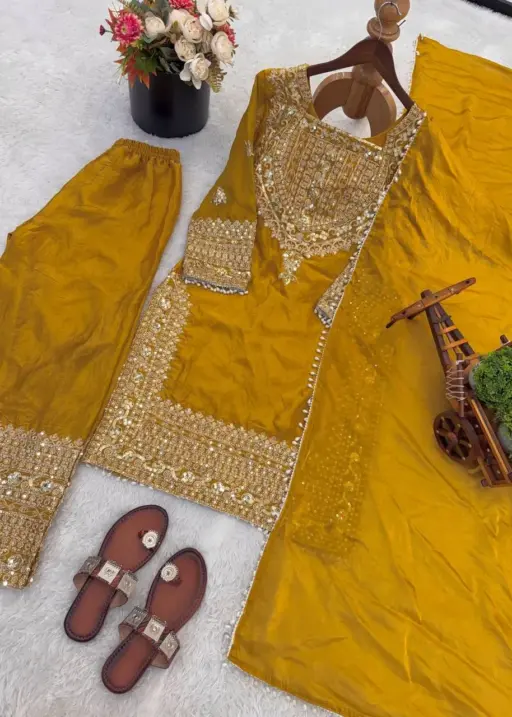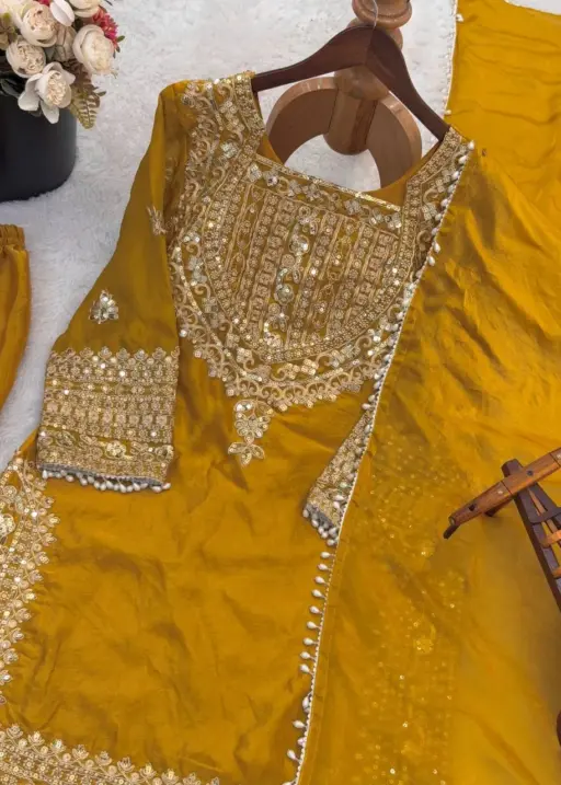 Mustard Wedding Readymade Embroidery Dress