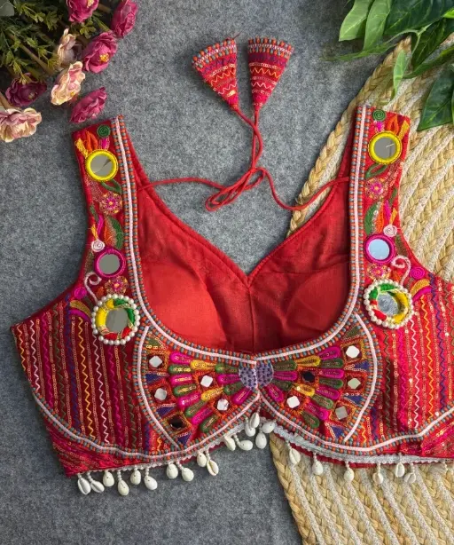 Pair this blouse with a mirror-work lehenga or contrast chaniya choli to create a head-turning Navratri look. Add oxidized jewellery, bangles, and a traditional bindi to complete your ensemble.