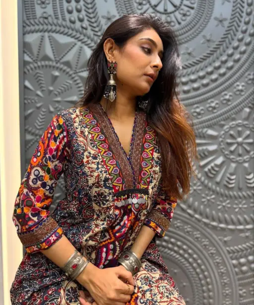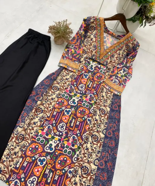 | Top | Printed Rayon with Coin Lace Work on Neck, Free Size, Height 48 Inch |