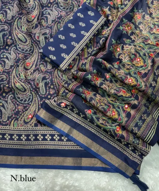 | Pattern | 1- morror work in full saree, 2 – Ajrakh Printed saree with zari jacquard border, 3- Tussles in pallu |