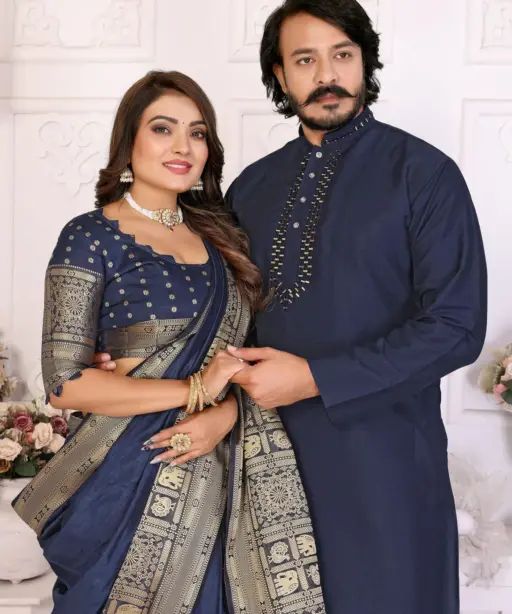 Navy Blue Color Couple Combo Saree with Kurta Design